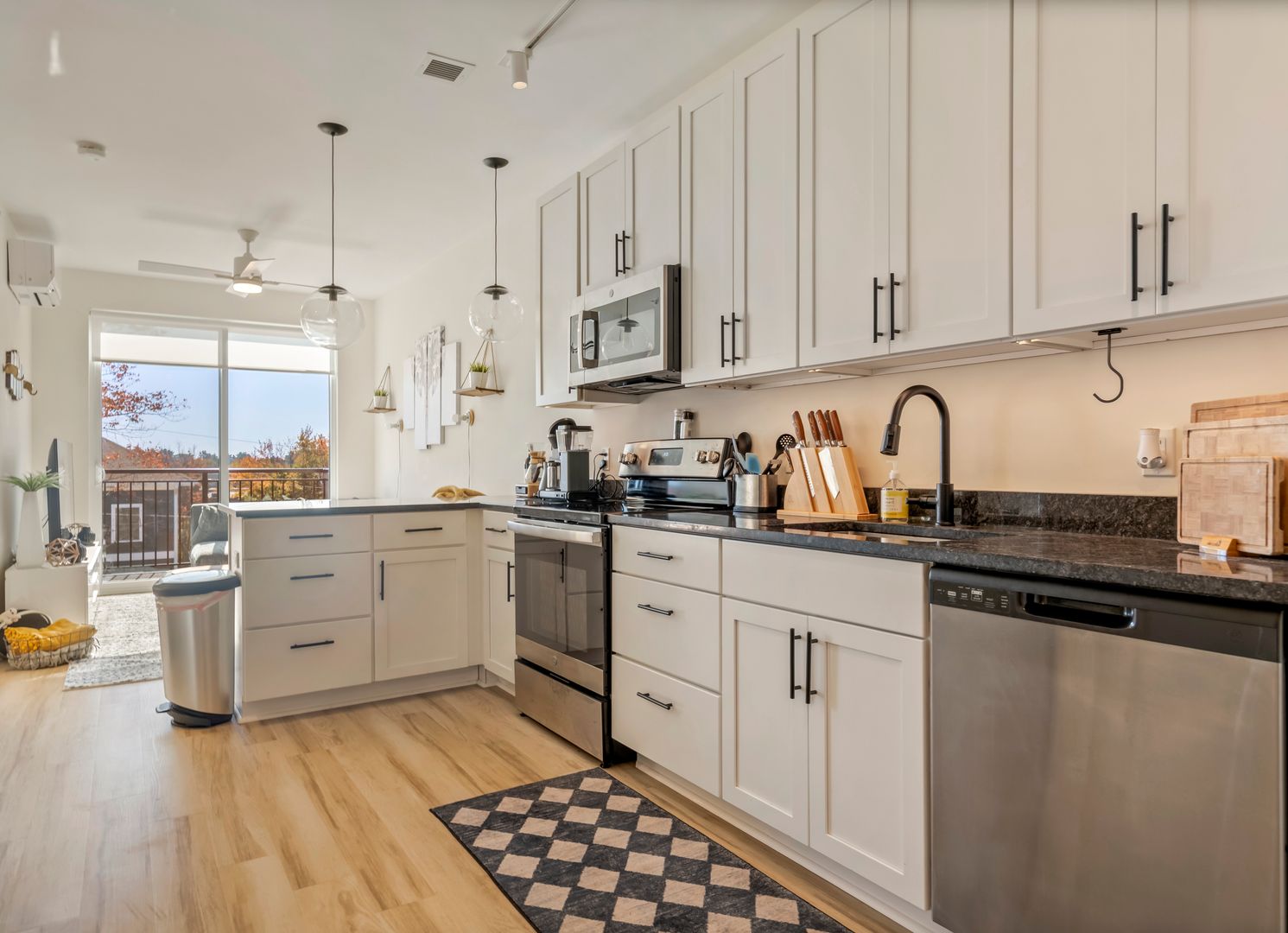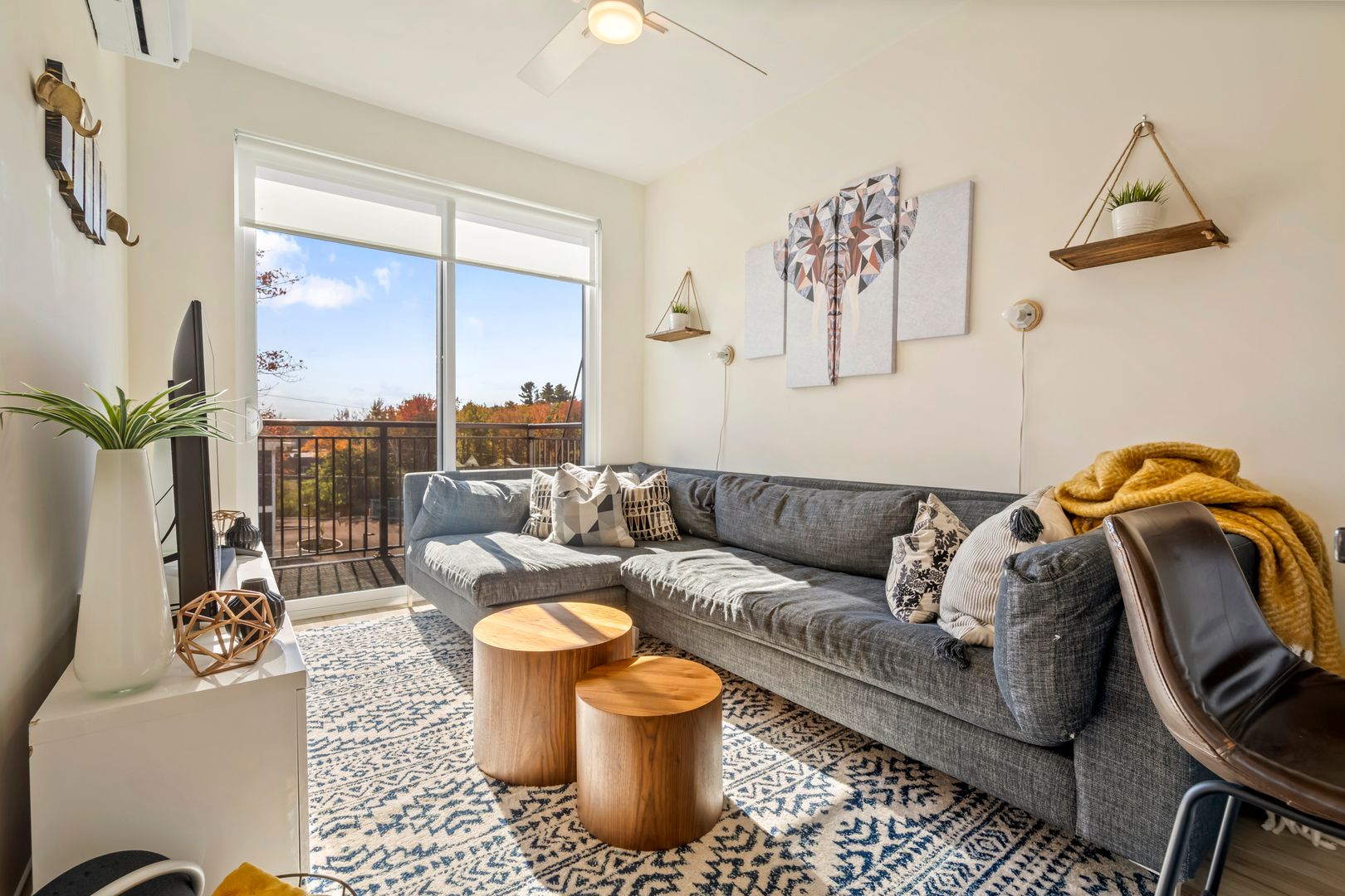 THE SEBAGO is a spacious one bedroom, one bath apartment with den that offers flexible space for your home office. It features floor-to-ceiling windows and doors, a walk-in primary closet, in-unit washer and dryer, and a private balcony. This sunny apartment's kitchen includes white shaker-style cabinets, undermount soft close dovetail drawers, stainless steel energy-star appliances, and a peninsula with counter-height seating.