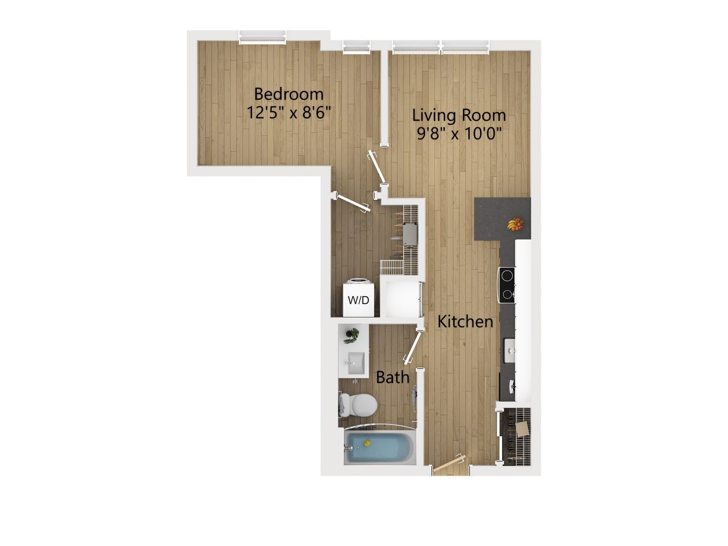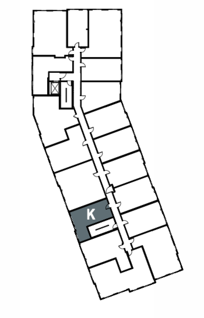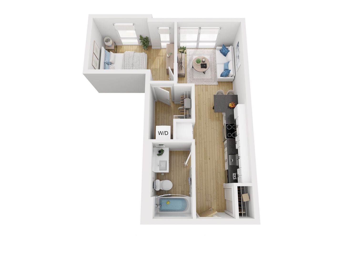 THE KATAHDIN is a one bedroom, one bath apartment featuring floor-to-ceiling windows, oversize walk-in closet and coat closet, and an in-unit washer and dryer. This sunny apartment offers white shaker-style cabinets, undermount soft close dovetail drawers, stainless steel Energy Star appliances, and a peninsula for counter-height seating overlooking the kitchen.